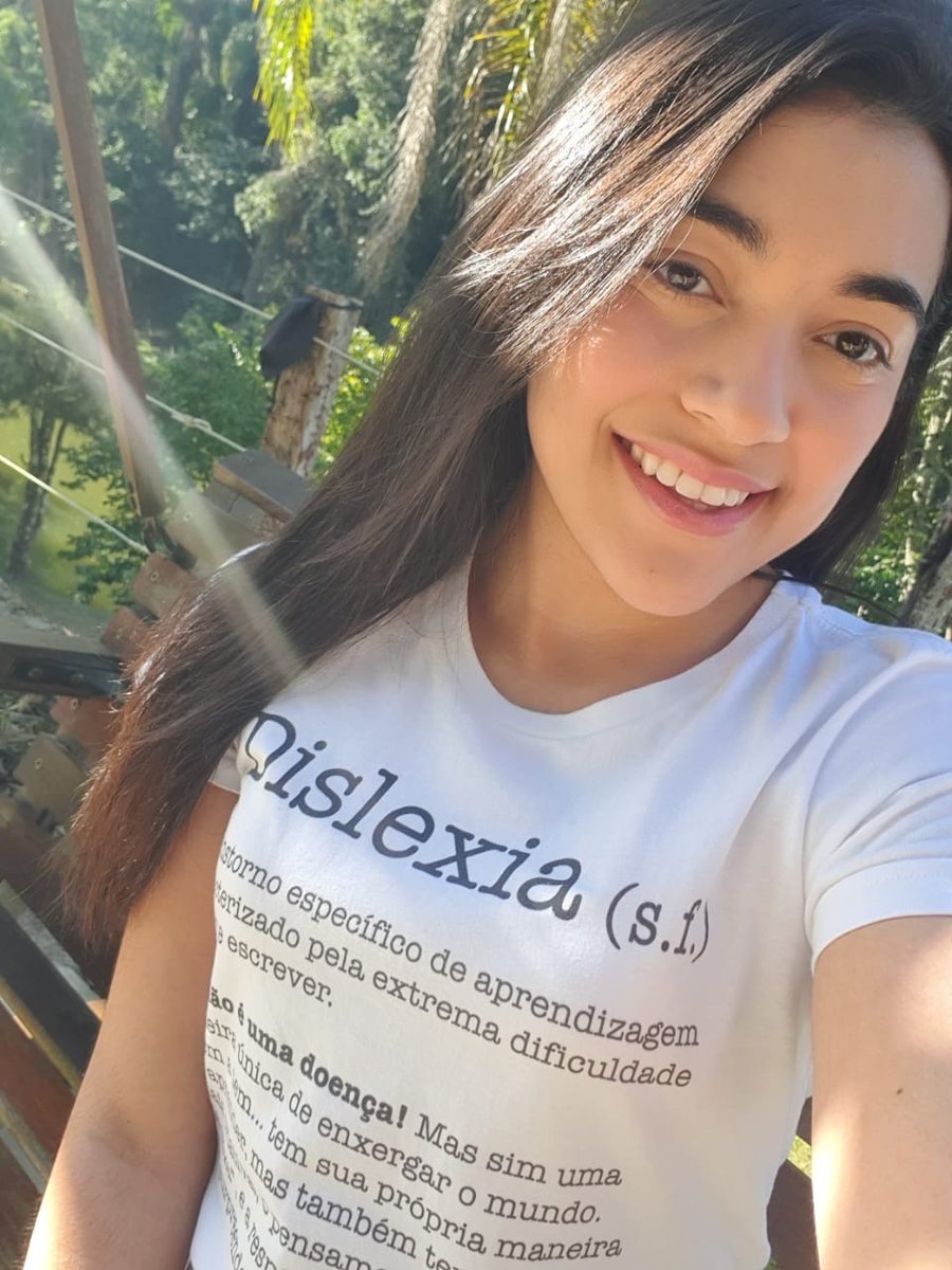 Texto da Camiseta Dislexia Poética Feminina "Transtorno específico de aprendizagem caracterizado pela estrema dificuldade de ler e escrever. Ela não é uma doença! Mas sim uma maneira única de enxergar o mundo. Quem a tem... tem sua própria maneira de aprender, mas também tem a mente mais criativa, o pensamento mais "fora da caixa", e a resposta mais sofisticada que surpreende todos a sua volta."